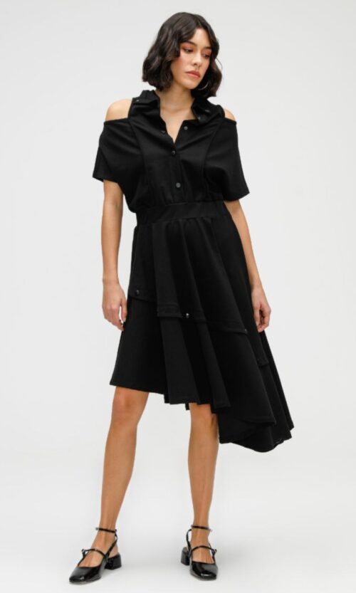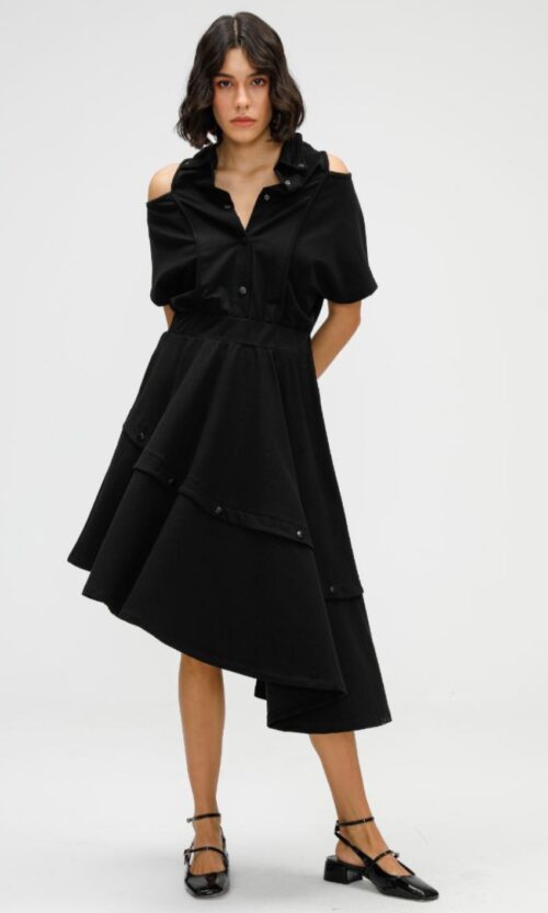 Rochie neagra midi cu crapatura adanca pe picior si umar gol